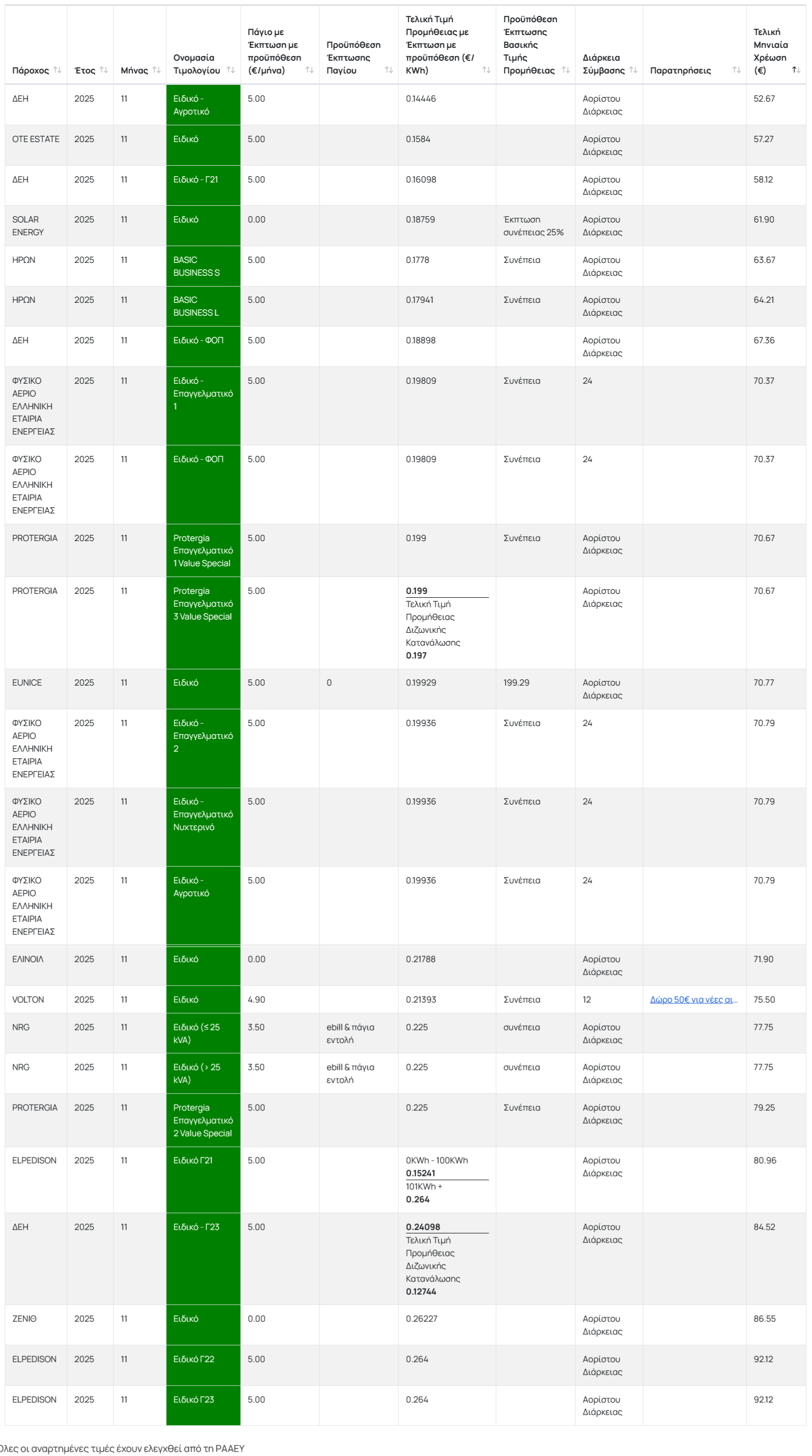 Έτσι, το εύρος των προϊόντων για το νέο μήνα φτάνει από τα 16 έως τα 26,4 λεπτά με μια μέση τιμή κοντά στα 20 λεπτά. Έτσι, επαγγελματίες και επιχειρήσεις είναι αντιμέτωποι με μια σημαντική άνοδο, ως αποτέλεσμα της ακριβότερης χονδρικής που ενισχύθηκε κατά 21% τον τελευταίο μήνα. Αναλυτικά, ο πίνακας με όλα τα πράσινα επαγγελματικά τιμολόγια ηλεκτρικού ρεύματος έχει ως εξής για το μήνα που διανύουμε: