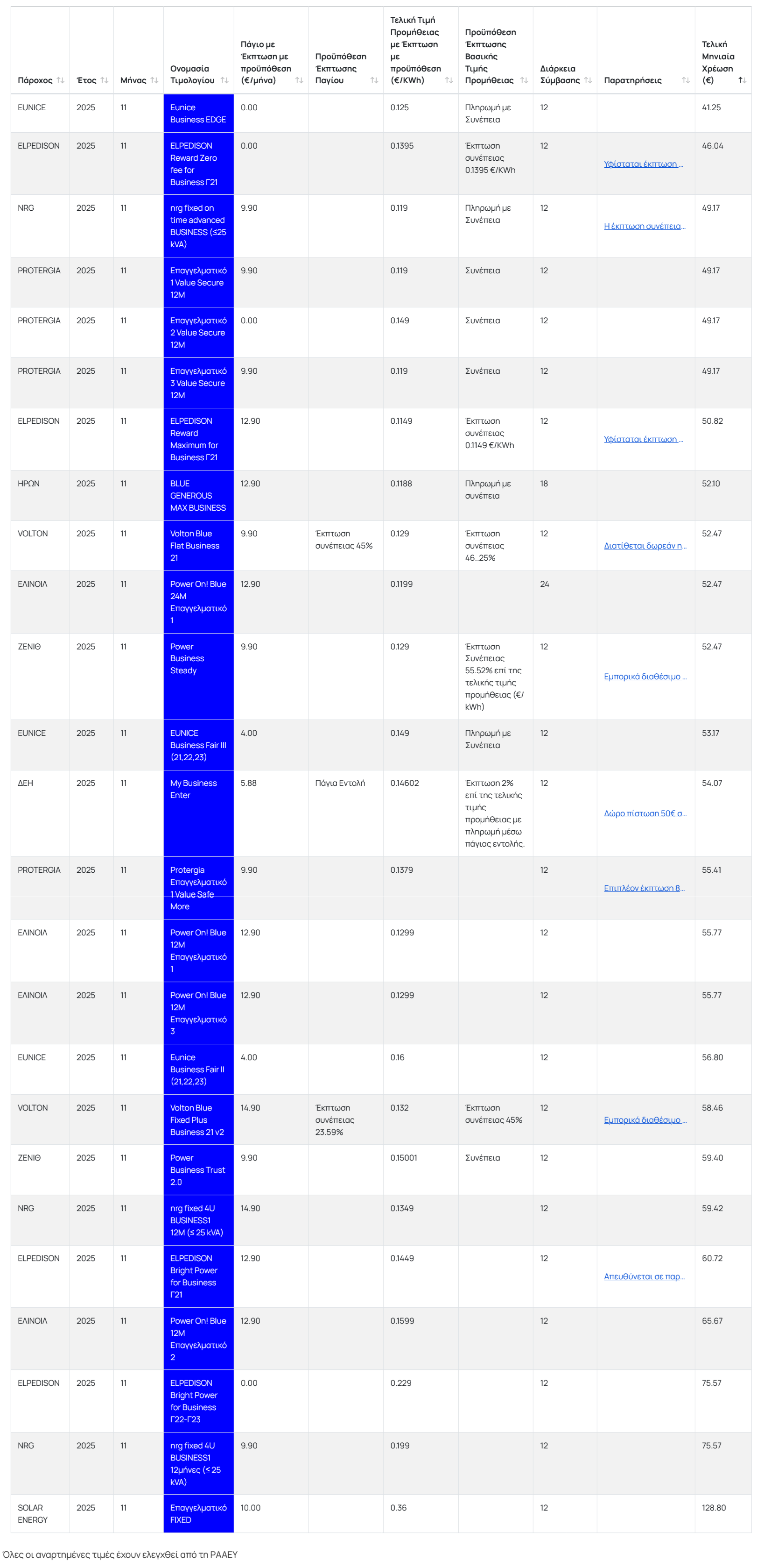 Αυξήσεις που κυμαίνονται από λιγότερο από 1 λεπτό έως και 4 λεπτά ανά κιλοβατώρα σημείωσαν τα επαγγελματικά τιμολόγια ηλεκτρικού ρεύματος για το Νοέμβριο.