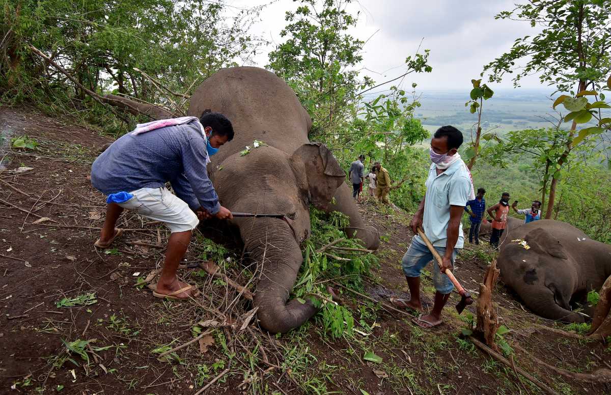 A forest official uses an axe to remove the trunk from a dead elephant that according to the forest officials possibly died because of a lightning strike, on the foothills of the Kundoli reserve forest area in Nagaon district in the northeastern state of Assam, India, May 14, 2021. REUTERS
