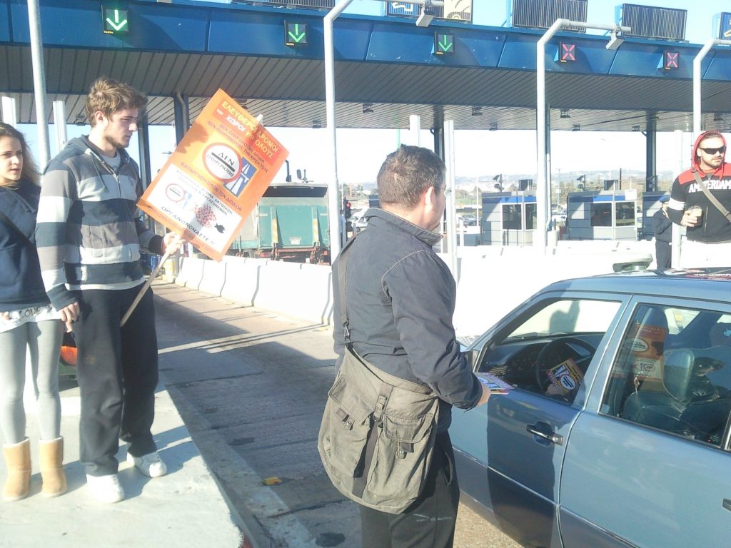 Μέλη του “ΔΕΝ ΠΛΗΡΩΝΩ” σήκωσαν τις μπάρες και άφησαν τους οδηγούς να περνούν ελεύθερα. ΦΩΤΟ NEWSIT.