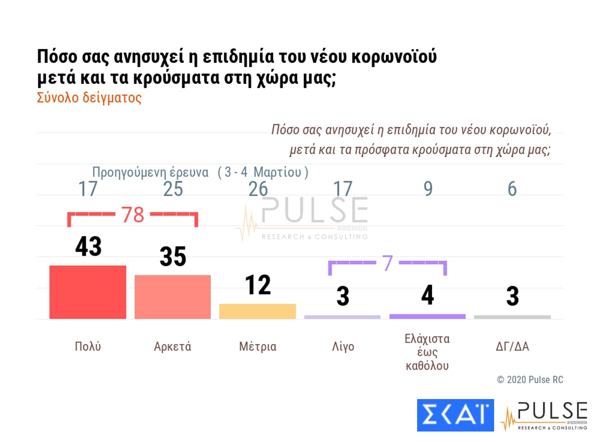 Την έντονη ανησυχία των πολιτών απέναντι στον κορονοϊό καταγράφει η δημοσκόπηση της εταιρείας Pulse για τον ΣΚΑΙ.