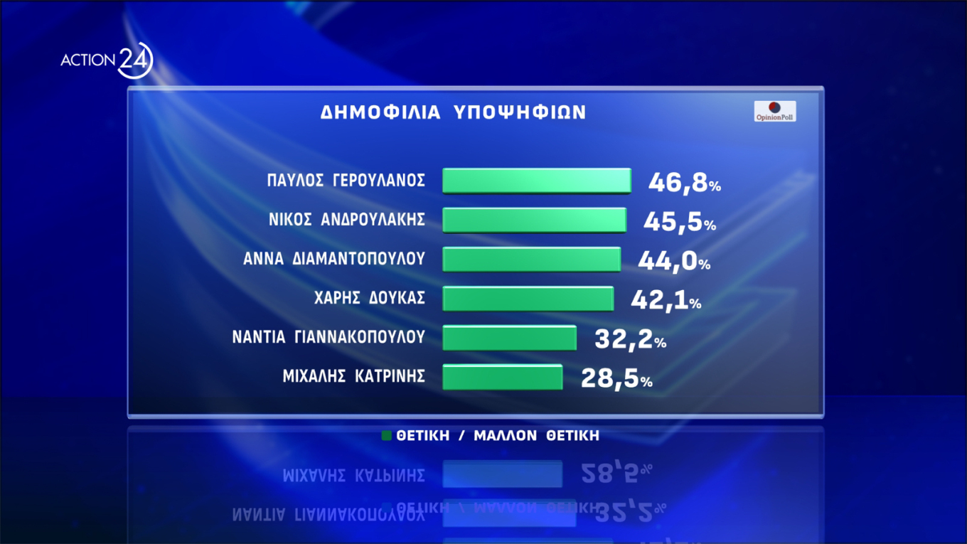 Οι υποψήφιοι εμφανίζουν την κάτωθι δημοφιλία στην κοινή γνώμη: Γερουλάνος 46.8%, Ανδρουλάκης 45.5%, Διαμαντοπούλου 44%, Δούκας 42.1% , Γιαννακοπούλου 32.2%, Κατρίνης 28.5%.