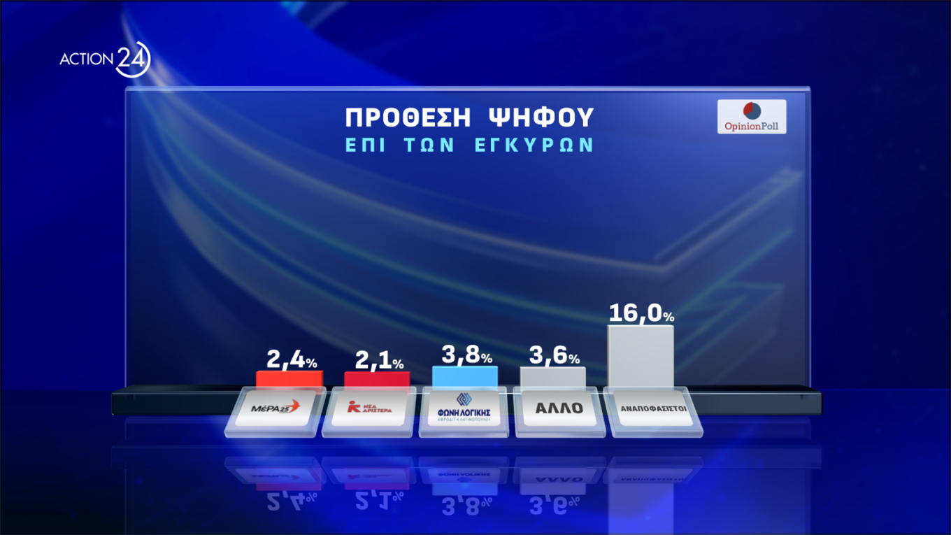 Στην πρόθεση ψήφου η Ν.Δ προηγείται με 25% με 12.1% διαφορά του σταθερά πια δεύτερου ΠΑΣΟΚ που εμφανίζεται με 12.9% ανεβάζοντας την επίδοσή του. Συνεχίζεται η πτώση του ΣΥΡΙΖΑ που βρίσκεται πια στην 5η θέση με 7.1%. Στην τρίτη και τέταρτη θέση βρίσκονται πια αντίστοιχα το Κ.Κ.Ε με 8.1% και η ΕΛΛΗΝΙΚΗ ΛΥΣΗ με 7.2%. Ακολουθούν ΦΩΝΗ ΛΟΓΙΚΗΣ με 3.5%, ΠΛΕΥΣΗ ΕΛΕΥΘΕΡΙΑΣ με 3.3%, ΝΙΚΗ με 3.1%, ΜΕΡΑ 25 με 2.2%, ΝΕΑ ΑΡΙΣΤΕΡΑ με 1.9%. Άλλο κόμμα δηλώνει το 3.3%. Η γκρίζα ζώνη ( λευκό, άκυρο,αποχή , αναποφάσιστοι ) αθροίζεται στο 22.4%