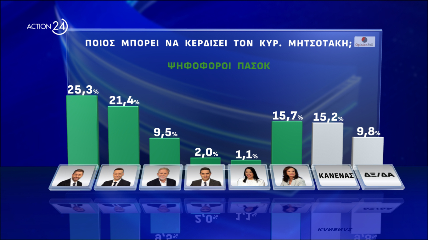 Στους ψηφοφόρους ΠΑΣΟΚ: 25.3%- 21.4%- 15.7%- 9.5%, με το 15.2% να δηλώνει τον Κανένα