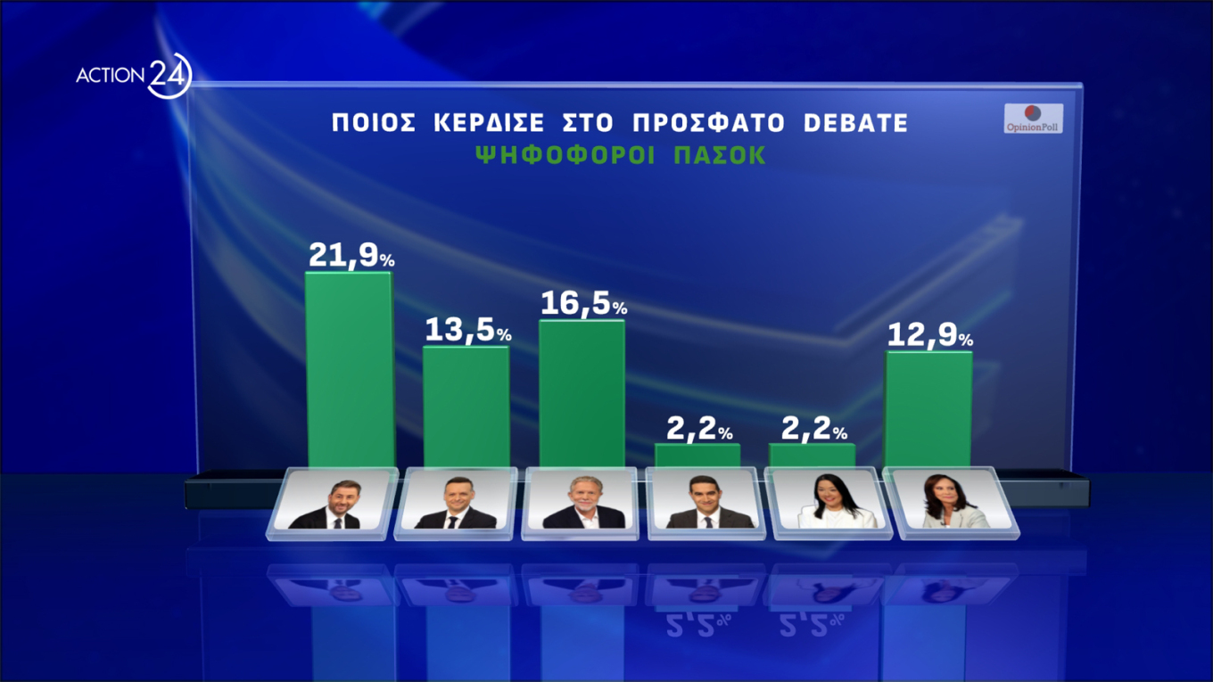 Στο σύνολο της κοινής γνώμης στην ερώτηση ποιον θεωρούν ότι κέρδισε στις εντυπώσεις τα αποτελέσματα είναι: Ν. Ανδρουλάκης 14.2%, Π. Γερουλάνος και Χ. Δούκας 11.4%, Α. Διαμαντοπούλου 10.3% Ν. Γιαννακοπούλου 2.7%, Μ. Κατρίνης 2.4%, Κανένας 7%, ενώ το 37.2% δεν το παρακολούθησε και τον 3% δεν απαντά