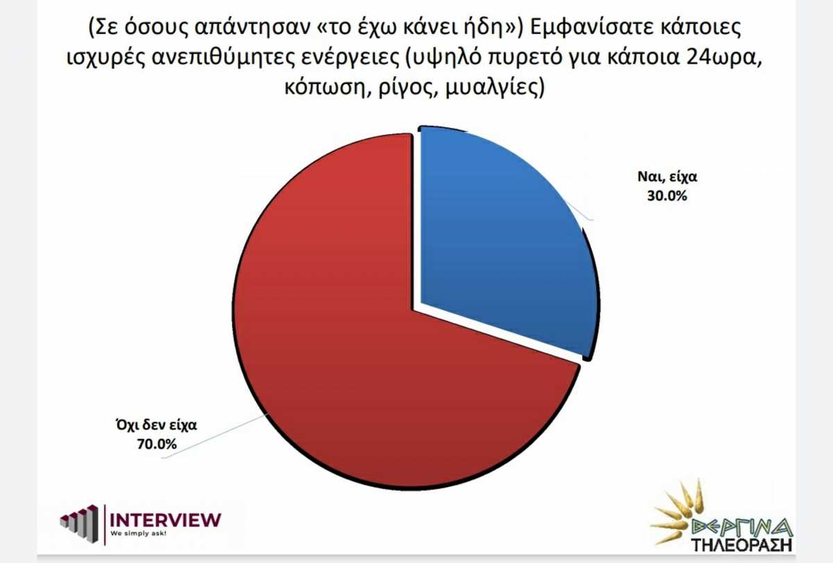 Εξ όσων εμβολιάστηκαν, το 70% δηλώνει ότι δεν εμφάνισε καθόλου παρενέργειες.