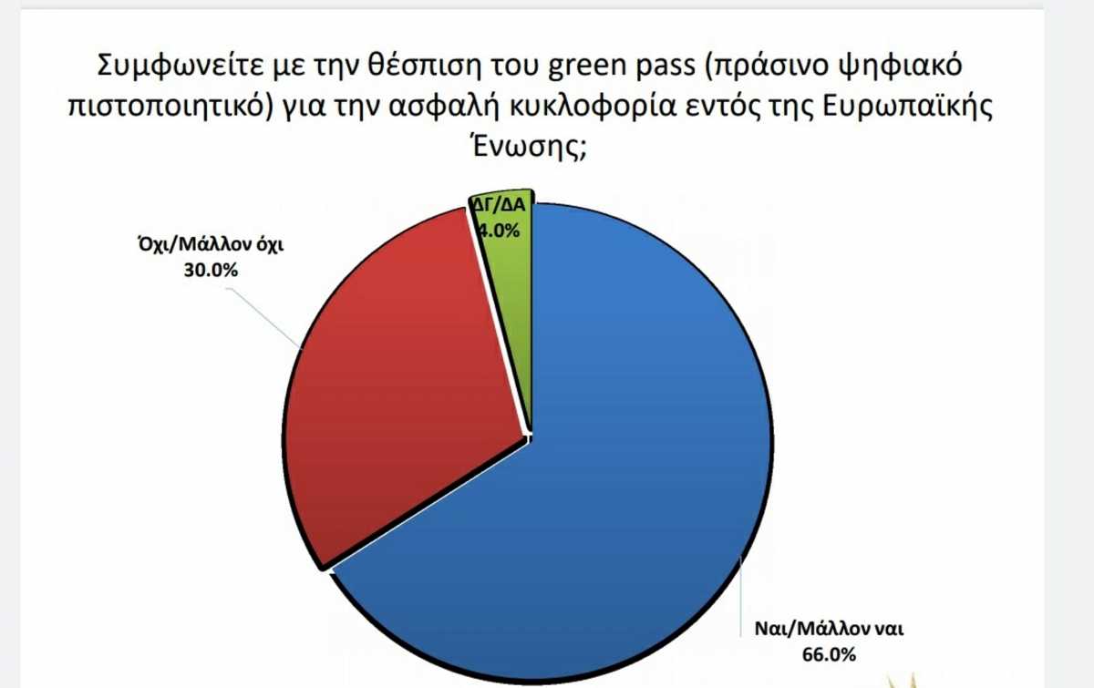 Υπέρ της θέσπισης του πράσινου ψηφιακού πιστοποιητικού εμφανίζεται το 66% των ερωτηθέντων καθώς και της άρσης της πατέντας των εμβολίων (58%).