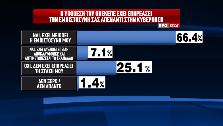 Λόγω της υπόθεσης του ΟΠΕΚΕΠΕ, το 66,4% δηλώνει ότι έχει μειωθεί η εμπιστοσύνη του στην κυβέρνηση.