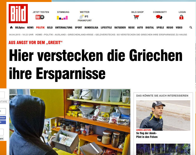 Μόνο γέλια μπορεί να προκαλέσει το νέο, προκλητικό και ειρωνικό δημοσίευμα της γερμανικής εφημερίδας Bild για την Ελλάδα. “Δείτε που κρύβουν τα λεφτά τους οι Έλληνες υπό το φόβο του Grexit” είναι ο τίτλος του δημοσιεύματος, με την εφημερίδα να έχει… “στήσει” και την απαραίτητη φωτογράφιση για να δείξει στους αναγνώστες της που κρύβουν οι Έλληνες τα χρήματά τους.