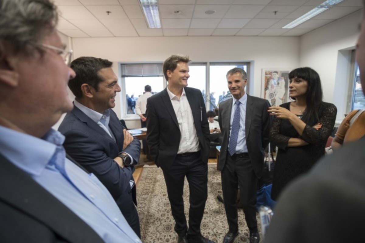 Το κλίμα ήταν εγκάρδιο μεταξύ των δύο ανδρών, ενώ στην συνέχεια ο πρωθυπουργός είχε έναν διάλογο με την Μπριζίτ Τρονιέ.