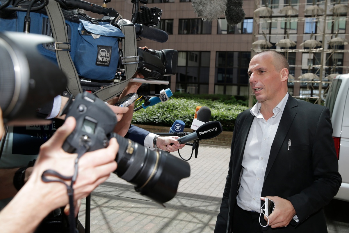 Ο Έλληνας υπουργός Οικονομικών εμφανίστηκε χαμογελαστός και χαλαρός, κρατώντας ένα κινητό τηλέφωνο. Φοράει ένα σικάτο μαύρο κοστούμι, λευκό πουκάμισο και χωρίς, φυσικά, γραβάτα.