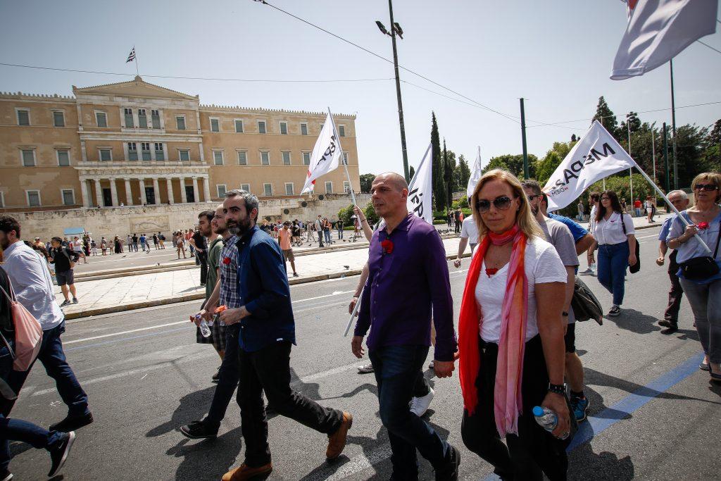 Με μοβ πουκάμισο, γαρύφαλλο στο πέτο (σχεδόν) και τη σύζυγό του Δανάη Στράτου (είχε κι εκείνη γαρύφαλλο) στο πλευρό του, ο Γιάνης Βαρουφάκης έδωσε το παρών στην πορεία για την εργατική Πρωτομαγιά.