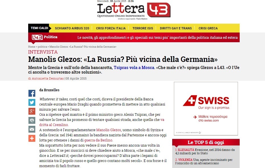Σε ερώτηση “αν, σε περίπτωση που η ΕΕ συνεχίσει να ζητά τον σεβασμό του προγράμματος της τρόικας, η Αθήνα θα κοιτάξει προς Ανατολάς”, ο κ. Γλέζος απαντά: “Μια χώρα σε κρίση, όπως η Ελλάδα, πρέπει να βρει, πρώτα απ’ όλα, λύσεις, και πρέπει να το πράξει επειγόντως. Η πρώτη στην οποία πρέπει να αποταθούμε είναι, φυσικά, η Ευρωπαϊκή Ένωση, και για τον λόγο αυτό μιλήσαμε, πρώτα απ’ όλα, με τους Ευρωπαίους εταίρους μας. Περιμένουμε να δείξουν κατανόηση”.