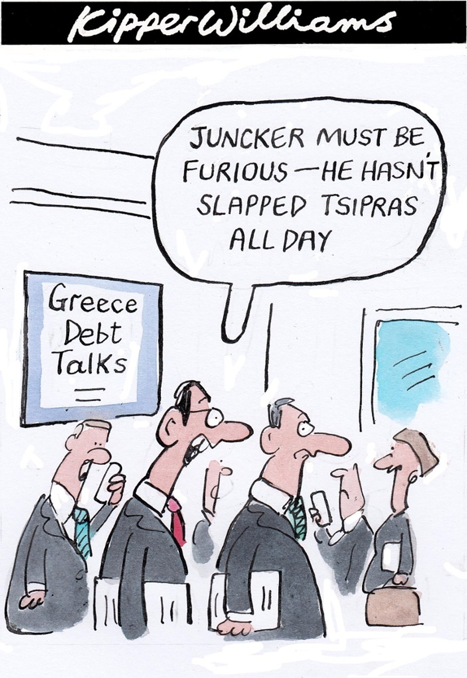 Φυσικά, όλα τα… λεφτά είναι το σκίτσο: Σε ένα δωμάτιο όπου γίνονται οι διαπραγματεύσεις για το ελληνικό χρέος, τεχνοκράτες συζητούν. Και ένας από αυτούς λέει: “Ο Γιούνκερ πρέπει να είναι έξαλλος. Δεν χαστούκισε τον Τσίπρα καθόλου όλη μέρα”!