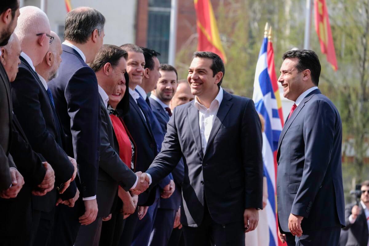 Ο Ζόραν Ζάεφ υποδέχτηκε τον Αλέξη Τσίπρα έξω από το προεδρικό μέγαρο με τους δύο πρωθυπουργούς να μην σταματούν να χαμογελούν, να αγκαλιάζονται και να ανταλλάσσουν φιλοφρονήσεις.