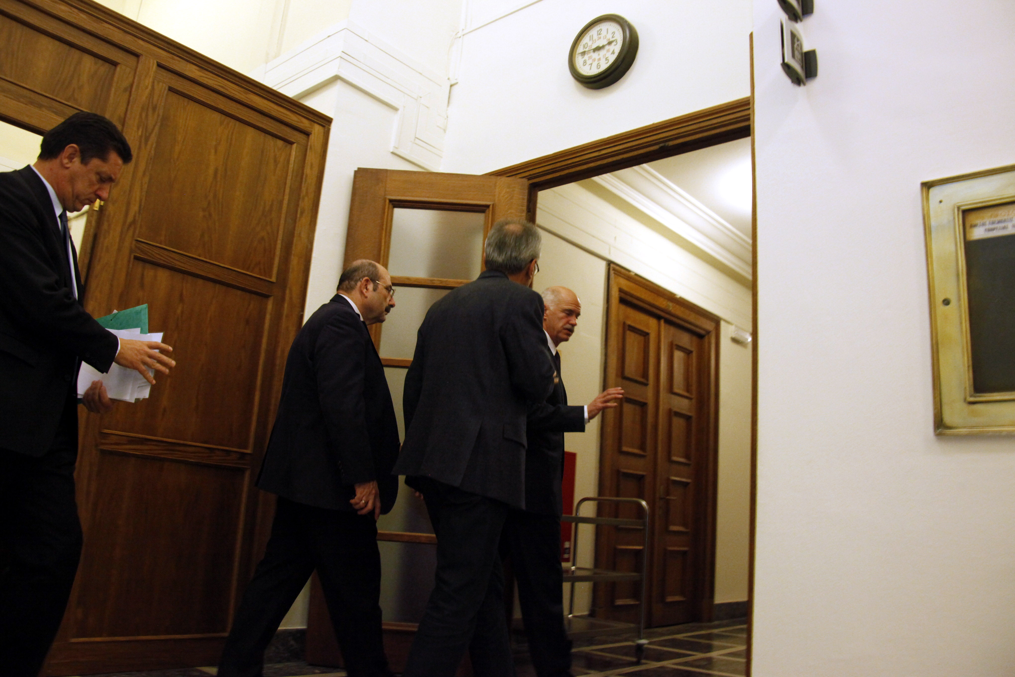 Πρόσωπα κουρασμένα, μέλη του υπουργικού συβουλίου ακόμα σε ένταση – δεν ήταν και λίγα αυτά που ειπώθηκαν μέσα στην αίθουσα – και μεγάλος απών ο Ευάγγελος Βενιζέλος ο οποίος ήταν λίγο παρακάτω στην Κεντρική Κλινική με πόνους στο στομάχι…