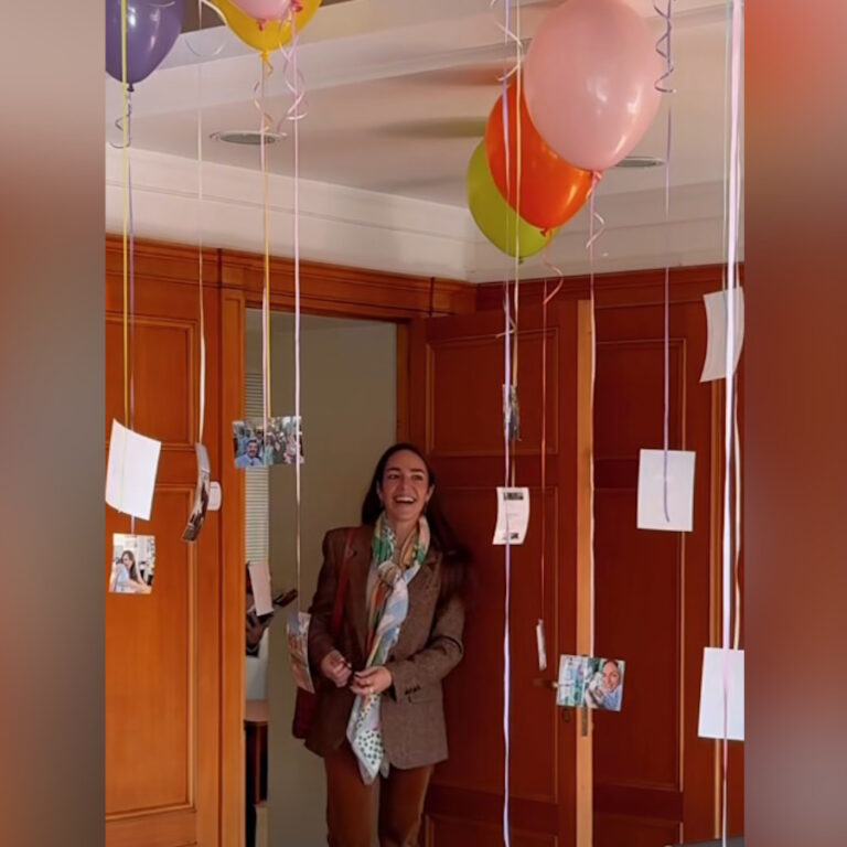 Ανοίγοντας την πόρτα, ανυποψίαστη, η Δόμνα Μιχαηλίδου βρέθηκε μπροστά σε πολύχρωμα μπαλόνια, που είχαν δεμένα πάνω τους φωτογραφίες της, από διάφορες στιγμές της ζωής της.