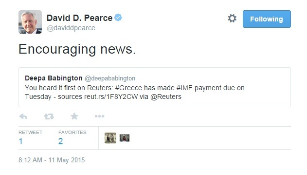 Την ικανοποίησή του για το γεγονός ότι η Ελλάδα πλήρωσε τη δόση των 750 εκατομμυρίων ευρώ στο Διεθνές Νομισματικό Ταμείο, εκδήλωσε μέσω Twitter, ο Ντέιβιντ Πιρς.