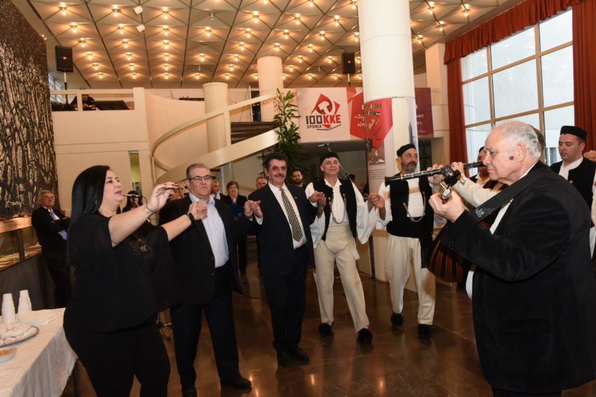 Φυσικά δεν έλειψαν και τα παραδοσιακά τραγούδια και οι χοροί, που κατέκλυσαν το φουαγιέ του Περισσού. Στον χορό μπήκε και ο Δημήτρης Κουτσούμπας, υπό τους ήχους ηπειρώτικων τραγουδιών.