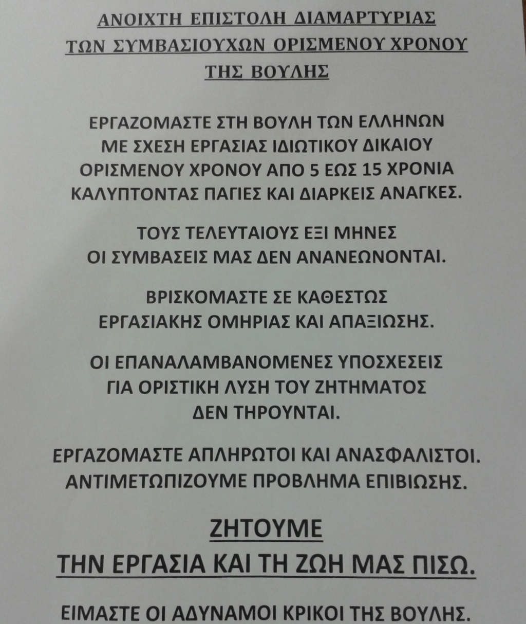 Δεν πρόκειται για τους γνωστούς υπαλλήλους της Βουλής που μέχρι πρότινος απολάμβαναν τεράστια προνόμια και ακόμα κάποια ισχύουν σε σχέση με άλλους εργαζόμενους, αλλά για 61 υπαλλήλους που έβγαλαν και ανοιχτή επιστολή στην οποία αναφέρουν τα προβλήματά τους.