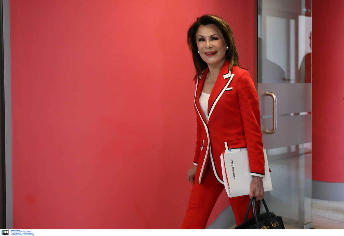 Με ένα κατακόκκινο κοστούμι που… ταίριαζε στο χώρο, η Γιάννα Αγγελοπούλου βρέθηκε στα γραφεία του ΣΥΡΙΖΑ στην Κουμουνδούρου, όπου την υποδέχτηκε ο Αλέξης Τσίπρας.
