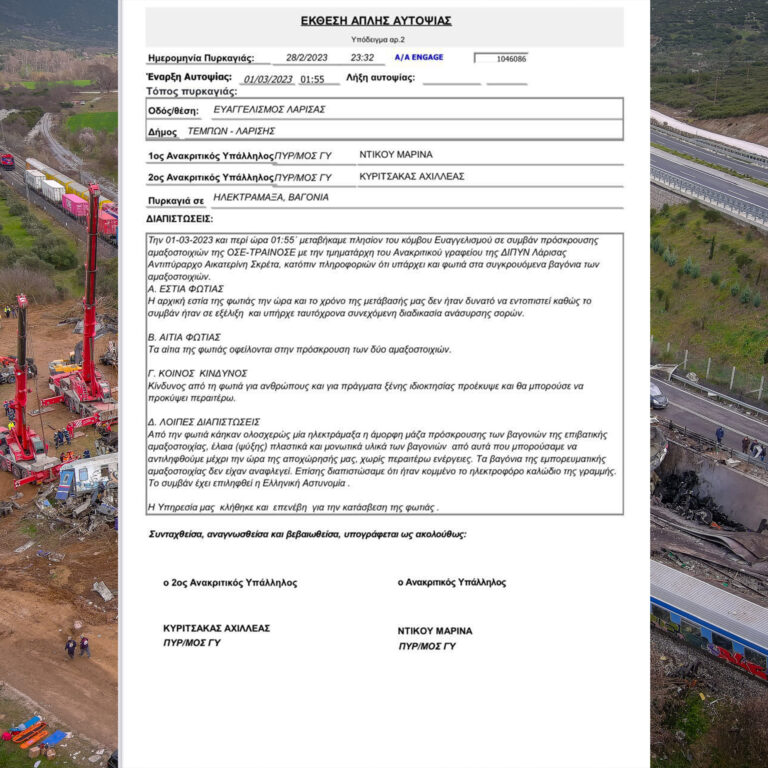 Με ένα έγγραφο απαντούν κυβερνητικές πηγές στην επίμονη ερώτηση του Εκπροσώπου Τύπου ΠΑΣΟΚ, Κώστα Τσουκαλά αν υπήρχε προγενέστερο έγγραφο της Πυροσβεστικής βάσει του οποίου ο κ. Μητσοτάκης εξέφρασε τη βεβαιότητα περί μη ύπαρξης εύφλεκτου υλικού και από ποιο σημείο του περιεχομένου του προκύπτει ότι η έκρηξη προήλθε αποκλειστικά και μόνο από τα έλαια των μηχανών στην σιδηροδρομική τραγωδία στα Τέμπη.
