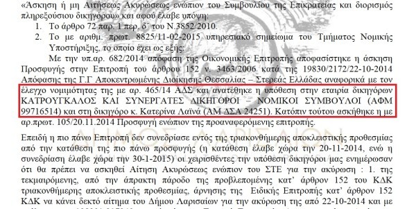 Με απόφαση της Οικονομικής Επιτροπής του δήμου Λαρισαίων τόσο η υπόθεση της προσφυγής κατά της απόφασης Γερακούδη όσο και οι επιβαλλόμενες από τους νομικούς Αιτήσεις Ακύρωσης της διαδικασίας ανατέθηκαν στο δικηγορικό γραφείο «Κατρούγκαλος & Συνεργάτες». Η ημερομηνία της ανάθεσης, σύμφωνα με τα έγγραφα, είναι 12 Φεβρουαρίου 2015, ενώ δηλαδή ο κ. Κατρούγκαλος έχει ορκιστεί υπουργός.