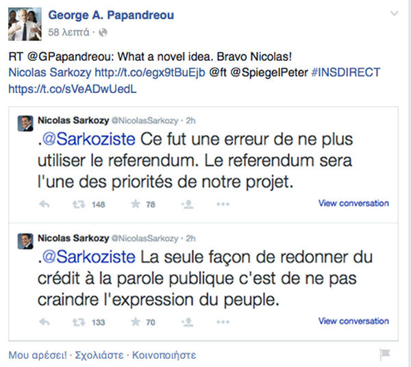 Και ο Παπανδρέου σχολιάζει με περισσή ειρωνεία: «Τι πρωτότυπη ιδέα. Μπράβο Nicolas!»
