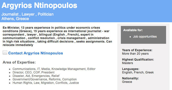 Στην αγγελία, ο Αργύρης Ντινόπουλος έχει ανεβάσει ένα πλούσιο βιογραφικό, αναφέροντας πως μιλάει Αγγλικά και Γαλλικά, πως είναι ειδικός στη διαχείριση κρίσεων, πως έχει 13 χρόνια εμπειρίας στην πολιτική υπό συνθήκες οικονομικής κρίσης, πως είναι δικηγόρος και πως παίρνει δύσκολες αποφάσεις.