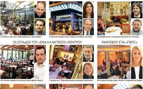 Αφήνοντας πίσω τα μοδάτα μπαρ του Κολωνακίου που άλλοτε φιλοξενούσαν προηγούμενα κυβερνητικά στελέχη, οι αριστεροί υπουργοί κινούνται στα Εξάρχεια αλλά και στην περιοχή που εκτείνεται από την πλατεία Συντάγματος μέχρι τα Πετράλωνα.