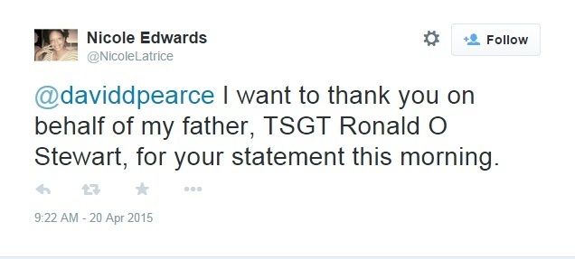 “Θέλω να σας ευχαριστήσω εκ μέρους του πατέρα μου, λοχία Ρόναλντ Ο. Στιούαρτ για τη δήλωσή σας σήμερα το πρωί”