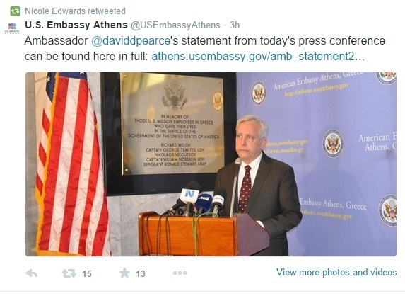 Μάλιστα, η κόρη του δολοφονημένου από τη 17Νοέμβρη λοχία ανήρτησε στο δικό της λογαριασμό στο Twitter όλη τη σημερινή παρέμβαση του Αμερικανού πρέσβη.