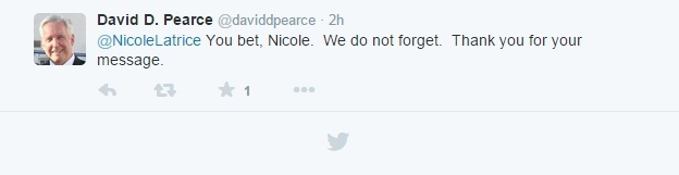 Για να λάβει την άμεση απάντηση του κ. Πίρς: “Να είσαι σίγουρη Νικόλ. Δεν ξεχνάμε. Ευχαριστώ για το μήνυμά σου”.