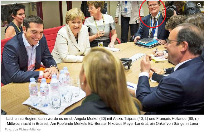 Αν πιστέψουμε τη Bild, ο τίτλος είναι απόλυτα κυριολεκτικός! Θείος γνωστής τραγουδίστριας κάθισε στο ίδιο τραπέζι με τον Έλληνα πρωθυπουργό, Αλέξη Τσίπρα, την καγκελάριο της Γερμανίας, Άνγκελα Μέρκελ και τον πρόεδρο της Γαλλίας, Φρανσουά Ολάντ για να συζητήσουν το ελληνικό ζήτημα.