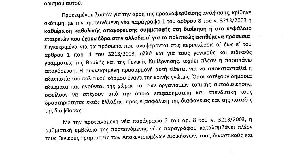 Όπως επισημαίνεται στην εισηγητική έκθεση, με τον τρόπο αυτό η ρύθμιση περιλαμβάνει και κράτη των οποίων το φορολογικό σύστημα είναι καταφανώς ελαφρύτερο έναντι του ελληνικού. «Όσοι κατέχουν δημόσια αξιώματα και ηγούνται της χώρας και των Οργανισμών Τοπικής Αυτοδιοίκησης, οφείλουν να απέχουν από την όποια επιχειρηματική και επενδυτική τους δραστηριότητα εκτός Ελλάδας, προς εξασφάλιση της διαφάνειας και της πάταξης της διαφθοράς» αναφέρει επίσης η εισηγητική έκθεση.