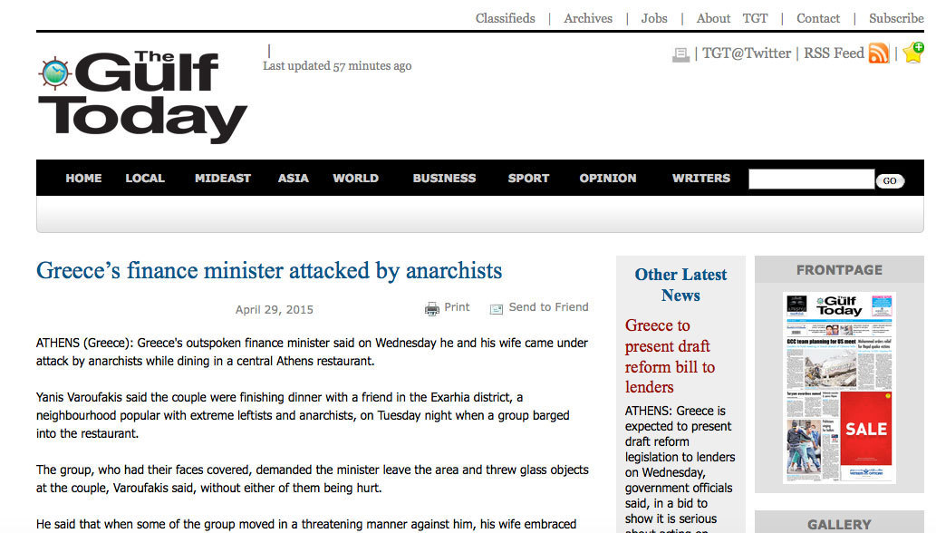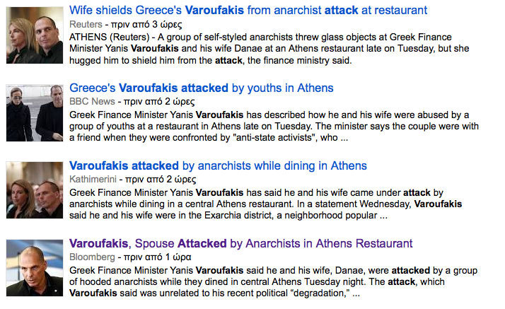 Το να γράψουν οι Financial Times, το Time, η Wall Street Journal, το CNN και το BBC για την επίθεση στον Έλληνα υπουργό Οικονομικών, Γιάνη Βαρουφάκη στα Εξάρχεια είναι κάτι που μπορεί να θεωρηθεί αυτονόητο.
