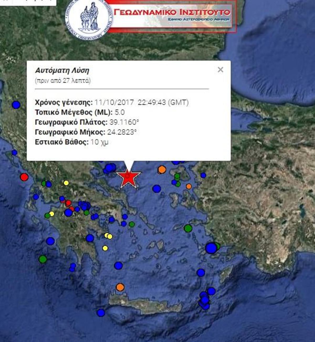 Ένας σεισμός μεγέθους 5 Ρίχτερ ταρακούνησε τις Σποράδες τα ξημερώματα της Πέμπτης (12.10.2017). Ο σεισμός έγινε αισθητός και στην Αττική.
