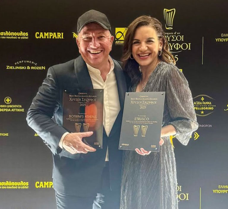 Πέρα από τις βραβεύσεις, το highlight της βραδιάς ήταν αναμφισβήτητα το δείπνο της τελετής απονομής των Χρυσών Σκούφων 2025, το οποίο δημιούργησαν και μαγείρεψαν αυτοπροσώπως οι executive chef της βραβευμένης με αστέρι Michelin Gucci Osteria da Massimo Bottura στη Φλωρεντία, η Karime López και ο Takahiko Kondo, συνδυάζοντας την μεξικανική εξωστρέφεια, τη ιαπωνική αισθητική και την ιταλική πληθωρικότητα. Ζευγάρι στη ζωή όσο και στις γαστρονομικές τους αναζητήσεις ακολουθούν σταθερά τη φιλοσοφία του μέντορά τους Massimo Bottura και για αυτόν τον λόγο καταχειροκροτήθηκαν, μαζί φυσικά με τον Jean-Louis Capsalas, executive chef του Asteria Domus και την μπριγάδα του, οι οποίοι έδωσαν τον καλύτερό τους εαυτό.