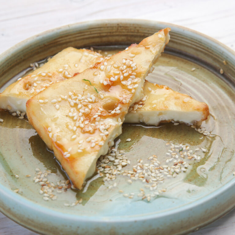 Έχει πολύ κοντινή γεύση με την τηγανητή φέτα τυλιγμένη σε φύλλο, που σερβίρεται με μέλι και σουσάμι.