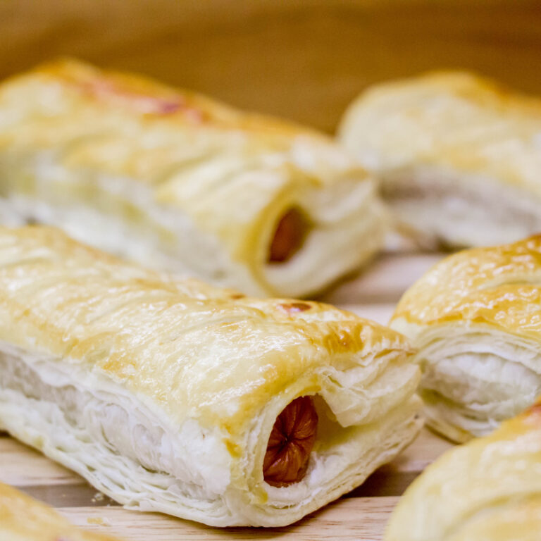 Είναι καλή ιδέα και για πάρτι, αφού κόβοντας την κάθε μία, σε 4-5 κομμάτια, έχεις νόστιμες μπουκιές με λουκάνικο και αφράτη σφολιάτα.
