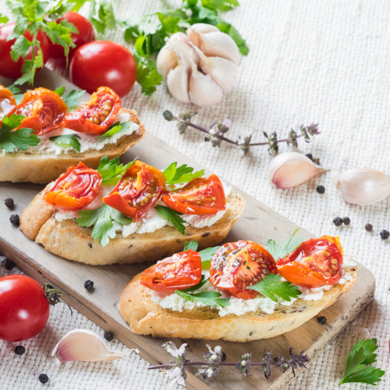 Μπρουσκέτες με ψητά ντοματίνια και γιαούρτι