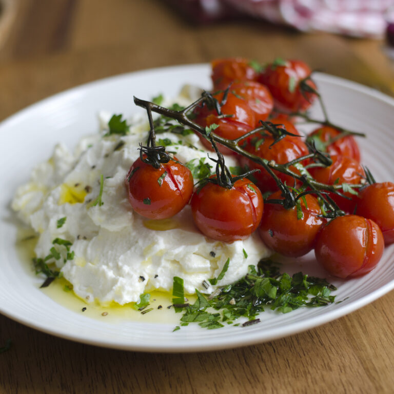 Η κρεμώδης ξινομυζήθρα αναμειγνύεται με σκόρδο και γιαούρτι, ενώ τα ψημένα ντοματίνια, που σερβίρονται μαζί, δίνουν άλλη γλύκα.