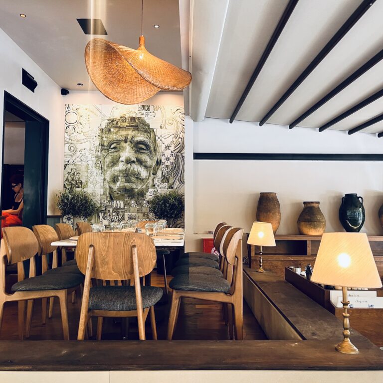 Όχι, δεν θα συναντήσετε εδώ την υπερβολή. Ο χώρος είναι ανοιχτός και φωτεινός, ενώ η σάλα, με τα κιούπια και το γνώριμο πορτρέτο του «Ντόπιου», έχει χαρακτήρα χωρίς τίποτα περιττό. Στη χαλαρή ατμόσφαιρα συμβάλει και η οροφή που ανοίγει όταν ο καιρός το επιτρέπει και φέρνει στα τραπέζια το φως και μια αίσθηση ελευθερίας.