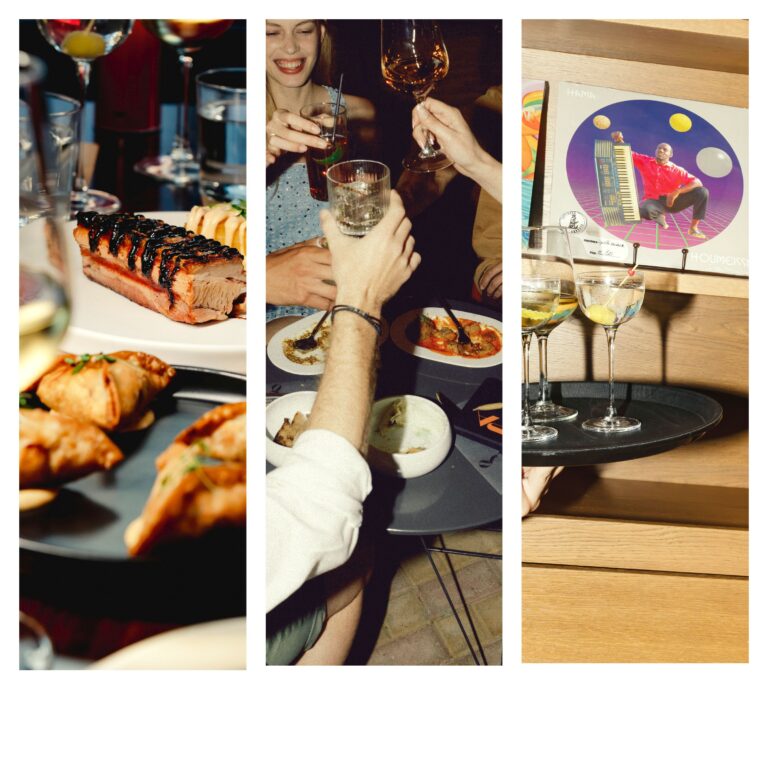 Το είπαμε και πριν, αλλά αξίζει να το επαναλάβουμε. Εδώ, η εμπειρία ολοκληρώνεται με την ατμόσφαιρα. Το Okupa δεν είναι απλώς ένα εστιατόριο: είναι ένα urban καταφύγιο, με mid-century αισθητική, πορτοκαλί καναπέδες, βινύλια, και ένα listening bar που καθορίζει τη διάθεση. Ο ήχος είναι αναλογικός, οι μουσικές curated και το vibe θυμίζει εκείνα τα μέρη που δεν φτιάχτηκαν για τις φωτογραφίες, αλλά για τις στιγμές. Στον πρώτο όροφο στεγάζεται ένα co-working space, ιδανικό για όσους θέλουν να δουλέψουν με φόντο jazz και φως από τα μεγάλα παράθυρα και στην ταράτσα με τη θέα στην πόλη βρίσκεται μια πισίνα για τους ενοίκους.