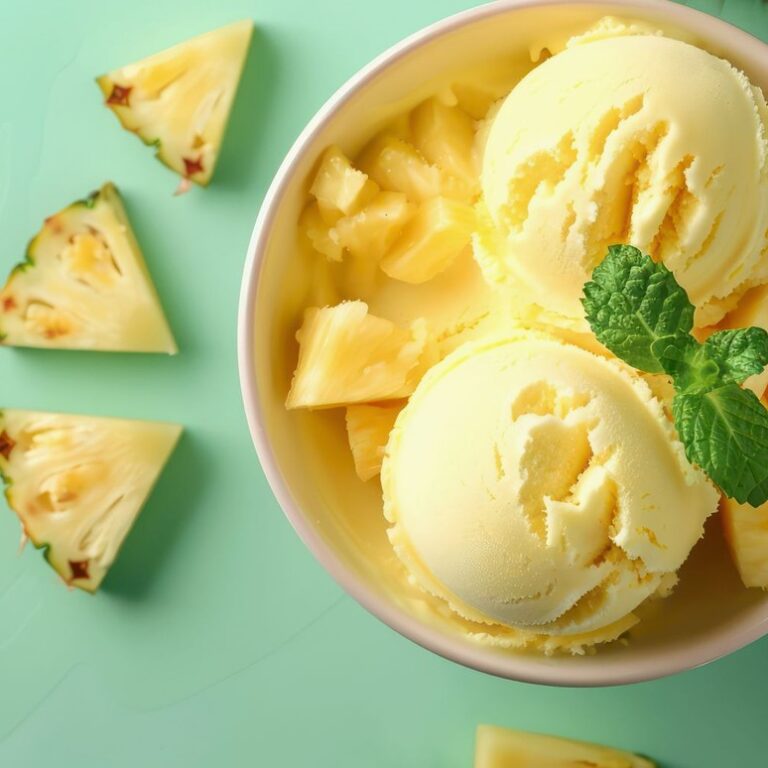 Τοποθετούμε ένα μεταλλικό δοχείο στην κατάψυξη για να παγώσει. Καθαρίζουμε τον ανανά και αφαιρούμε το σκληρό κεντρικό κομμάτι. Κόβουμε σε χοντρά κομμάτια.