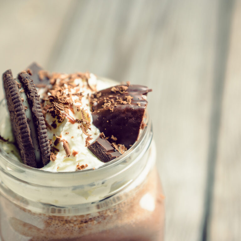 Σερβίρουμε αμέσως, γαρνίροντας με ένα ολόκληρο μπισκότο, ή εναλλακτικά διατηρούμε στο ψυγείο για 1-2 μέρες.