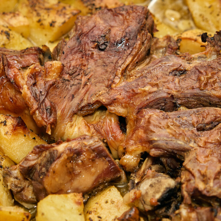 Κατσικάκι λεμονάτο με πατάτες στον φούρνο.