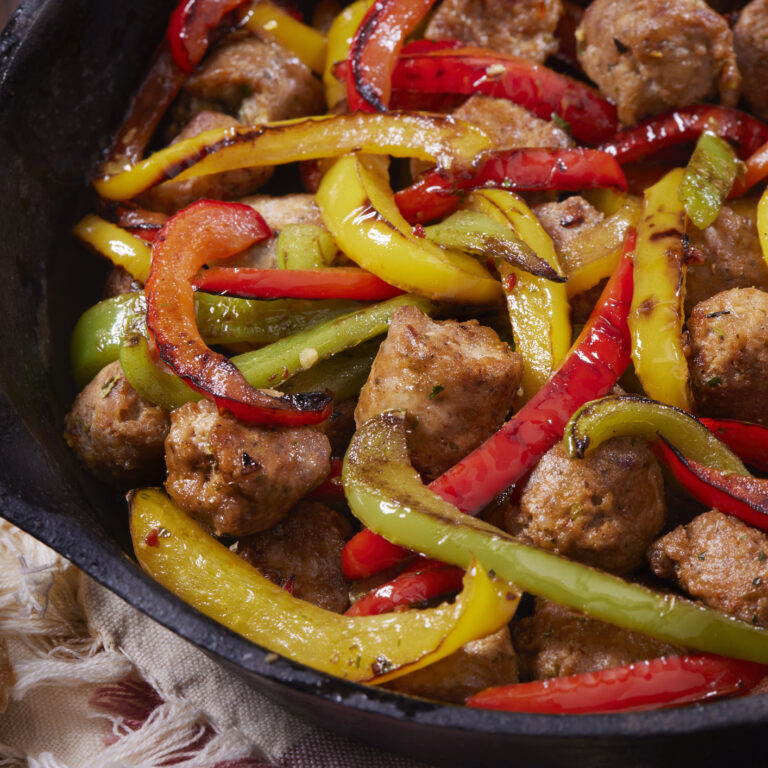 Η επιλογή του λουκάνικου είναι δική σας υπόθεση, αν και εγώ προτείνω το πικάντικο, αφού οι χρωματιστές πιπεριές και τα κρεμμύδια που ψήνονται, βγάζουν πολλή γλύκα και έτσι έχουμε ωραία ισορροπία με την «κάψα» από το χωριάτικο λουκάνικο.