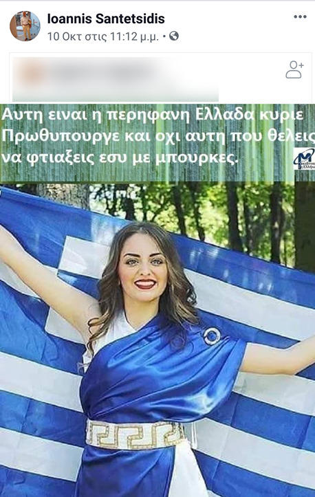 Λίγες ημέρες πριν είχε κοινοποιήσει μια φωτογραφία μιας γυναίκας με την ελληνική σημαία που συνοδευόταν από το σχόλιο: «Αυτή είναι η περήφανη Ελλάδα κύριε πρωθυπουργέ και όχι αυτή που θέλεις να φτιάξεις με μπούρκες».