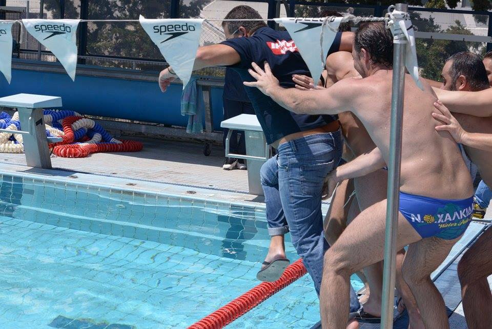 Μέσα στην χαρά του, ο… τυχερός – άτυχος της φωτογραφίας βρέθηκε μέσα στην πισίνα. “Ευχαριστώ πολύ τους παίκτες του ΝΟΧ για το ωραίο και δροσιστικό μπανάκι που μου προσέφεραν σε μια τόσο “καυτή” μέρα” δήλωσε ο Δημήτρης Μαμάκος ο οποίος δροσίστηκε από το πέσιμο στην πισίνα.